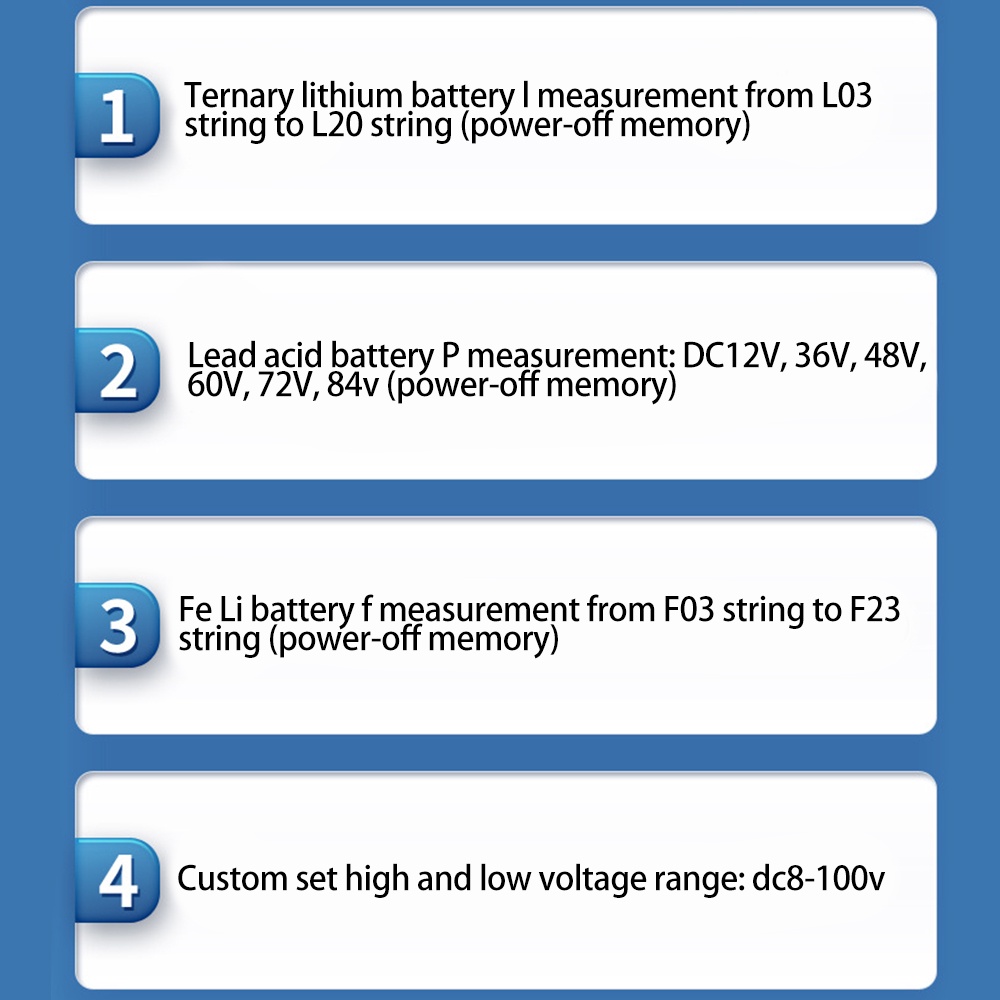 Đặc điểm: 1. Độ ổn định cao 2. Độ tin cậy cao 3. Thời gian sử dụng lâu dài 4. Với hiệu chuẩn sai số chính xác có thể điều chỉnh được 5. Bộ tùy chỉnh dải điện áp cao và thấp: DC8-100V 6. Đo lithium Lernary từ dòng L03 đến L20 (bộ nhớ hỏng nguồn) 7. Pin chì Đo P: DC12V, 36V, 48V, 60V72V, 84V (bộ nhớ hỏng nguồn) 8. Đo pin LiFePO4 F từ dây F03 đến F23 (bộ nhớ hỏng nguồn)