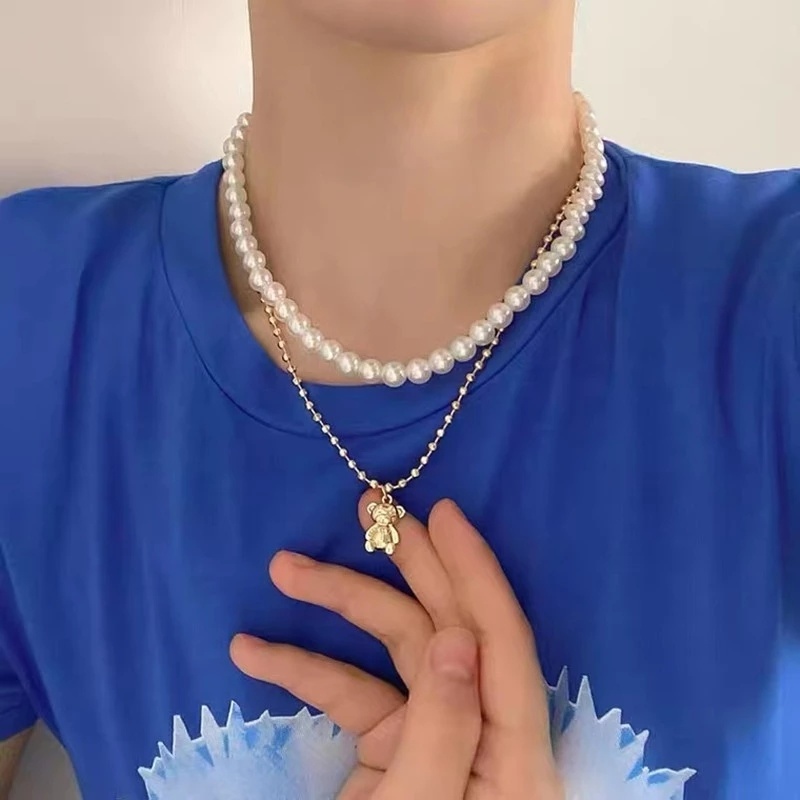 Giới thiệu Vòng cổ Hai Lớp Mặt Hình Gấu Đính Ngọc Trai Thời Trang Cho Nam Nữ