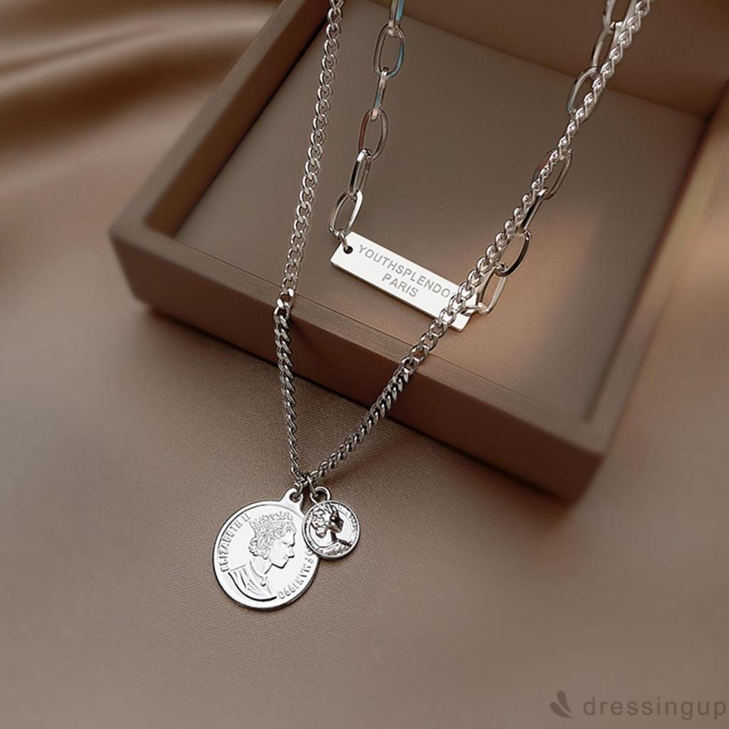 Vòng cổ hai lớp thời trang, vòng cổ chuỗi kim loại bảng tên đồng xu tượng đầu người trang sức cho nam nữ
