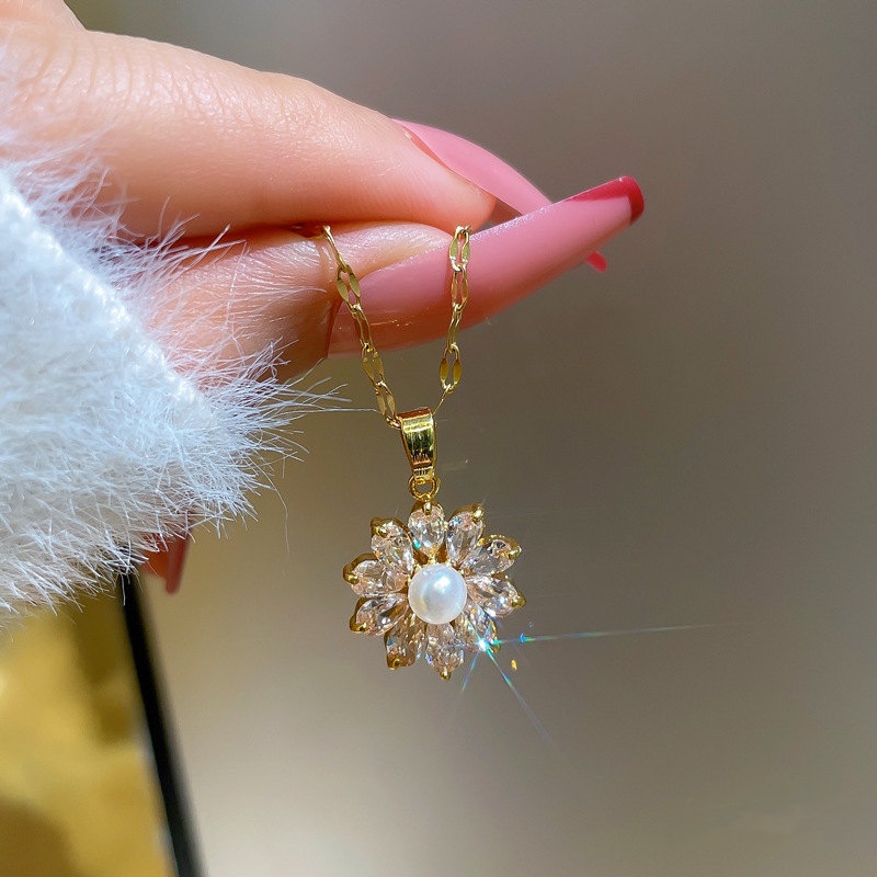 Giới thiệu Vòng cổ titan nữ thiết kế mặt hình hoa hướng dương đính ngọc trai phong cách thời sang trọng mẫu mới 2022