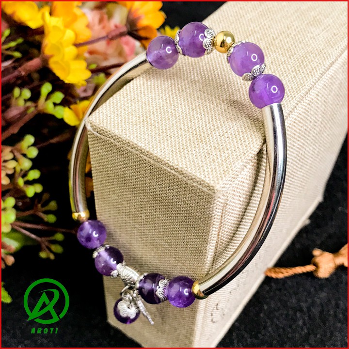 Giới thiệu Vòng Đeo Tay Nữ Mệnh Hỏa-Thổ - Vòng Tay Nữ Đá TA Tím Mix Cầu Kim Tiền 8mm V365-8