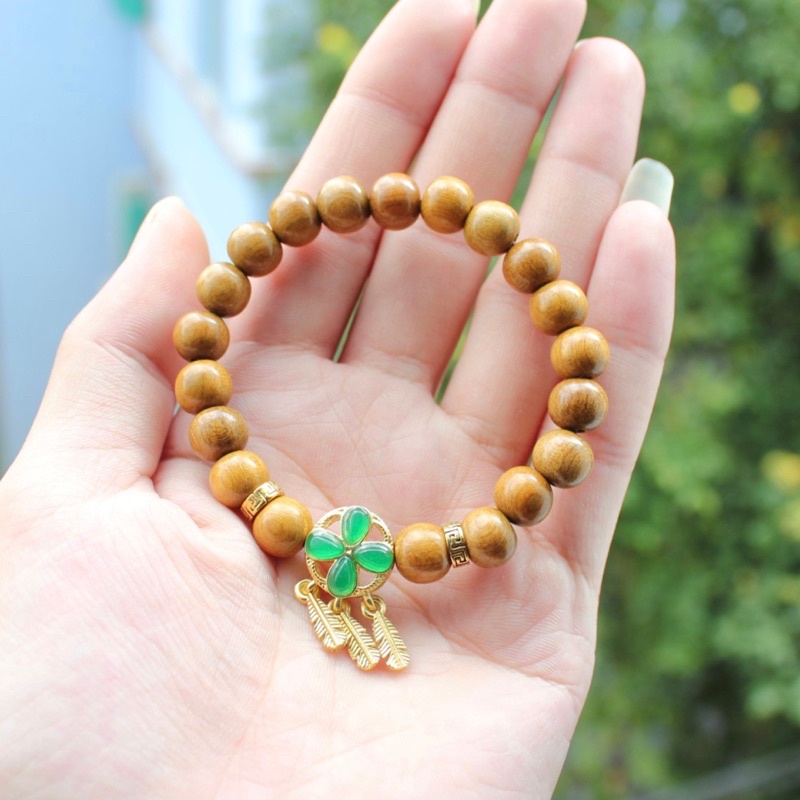 Giới thiệu Vòng tay gỗ thơm tự nhiên mix charm cỏ bốn lá may mắn size 8mn