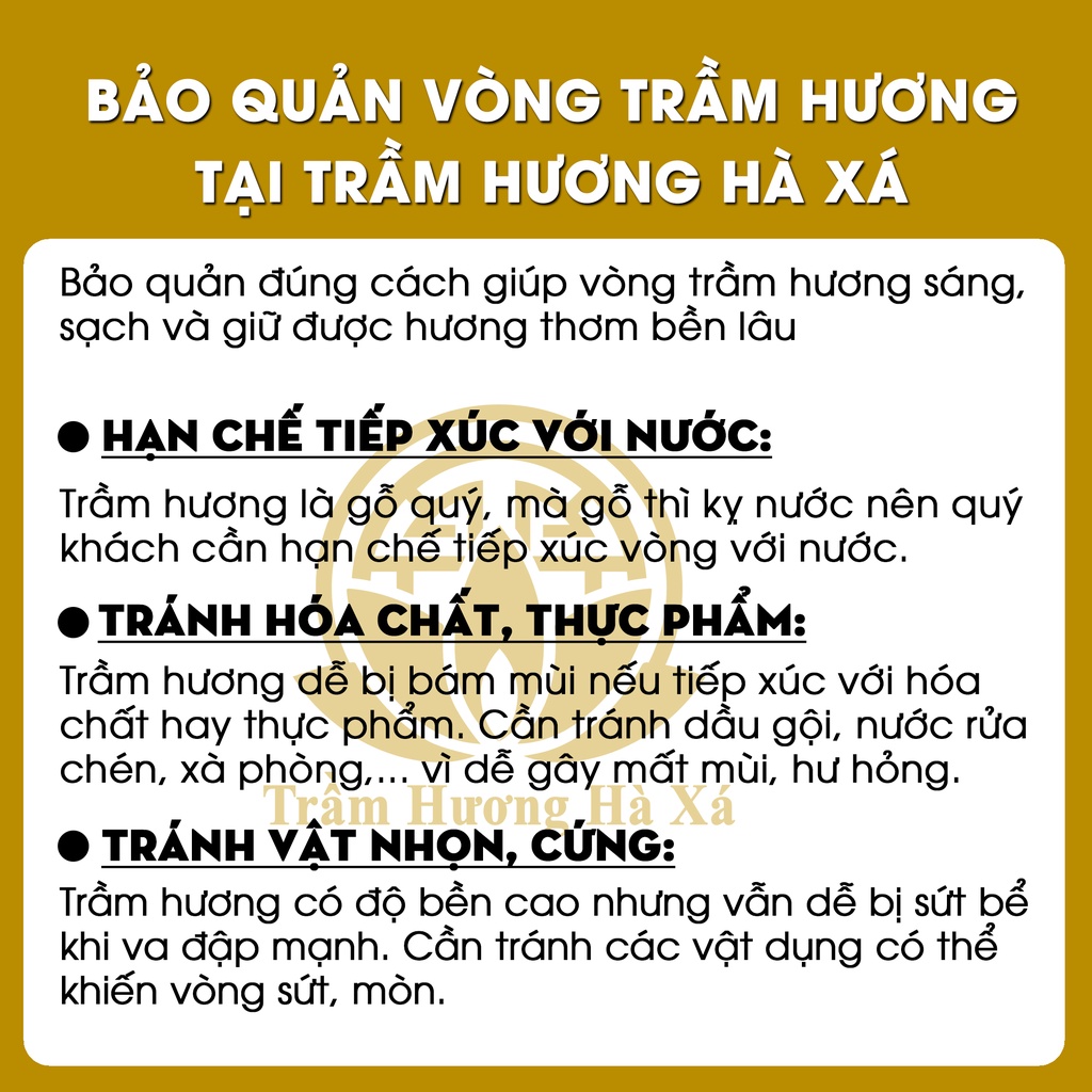 BẢO QUẢN VÒNG TAY PHONG THỦY TRẦM HƯƠNG - Hạt trầm hương là quý, nhẹ, mềm và hấp thụ chất lỏng nên chúng đòi hỏi sự chăm sóc tốt nhất để duy trì vẻ ngoài và mùi thơm của nó. Lưu ý không làm ướt vòng tay. Vì tiếp xúc với nước, hạt gỗ sẽ dễ bị nở ra, nứt, mục và bay mùi - Không đeo vòng trên cổ hoặc tay khi xịt nước hoa hoặc kem dưỡng da vì hạt trầm hương sẽ hấp thụ những chất đó và làm biến đổi tính chất của gỗ. Khi muốn đánh bóng hoặc vệ sinh vòng, hãy dùng vải cotton mềm.