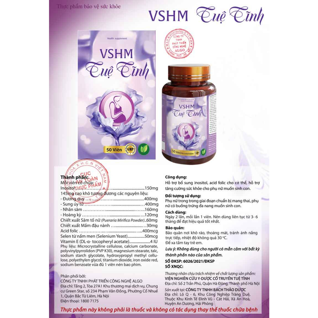 Công dụng VSHM Tuệ Tĩnh Theo giấy phép quảng cáo Số: 2211/2021/XNQC-ATTP do Cục ATTP – Bộ Y tế cấp thì VSHM Tuệ Tĩnh có công dụng hỗ trợ bổ sung inositol, acid folic cho cơ thể, hỗ trợ tăng cường sức khỏe cho phụ nữ muốn sinh con.
