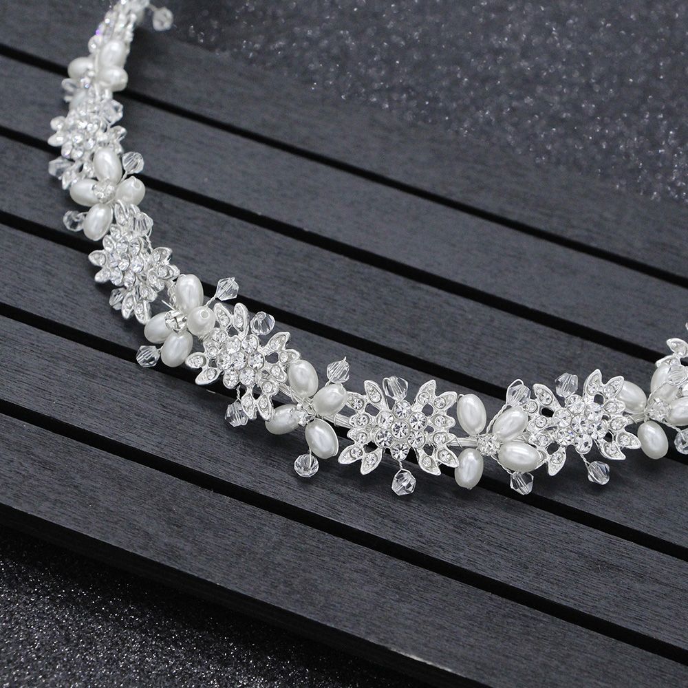 Width: 3.2cm Weight: 44g Metals: Zinc Alloy Package include:1Pc Color:Silver Type: Headbands Length: 35cm Material: Crystal,Pearl Gender: Women Note:The size of all our products are manual measurement, there may be 1-2cm error, please understand.