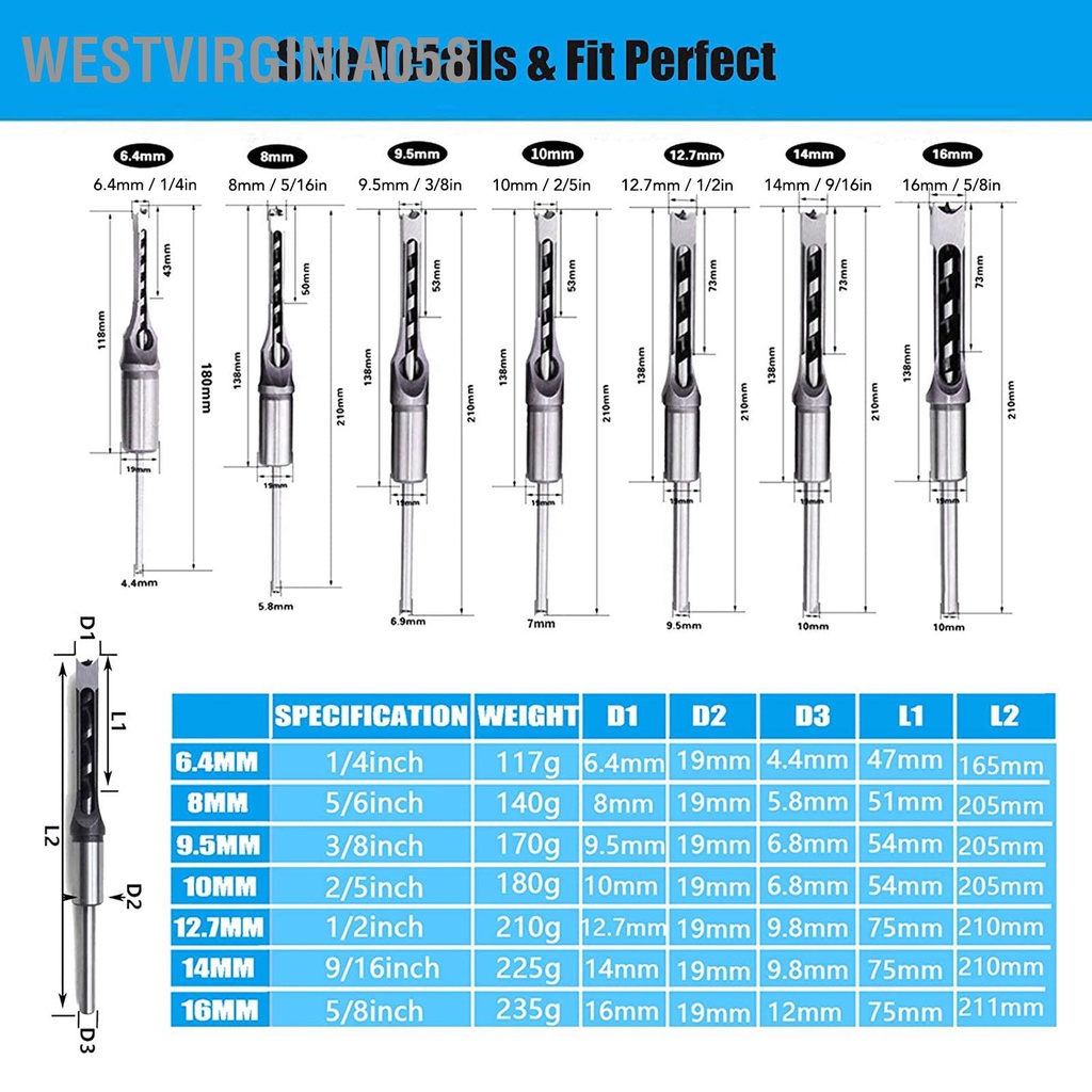 Giới thiệu Westvirginia058 7 Chiếc Gỗ Vuông Mũi Khoan 1/4in 5/16in 3/8in 2/5in 1/2in 9/16in 5/8in HSS Mortising Đục Bộ