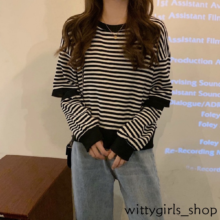 Giới thiệu Wittygirls-áo Thun Tay Dài Dáng Rộng Họa Tiết Kẻ Sọc Mùa Thu Mới Cho Nữ Sinh
