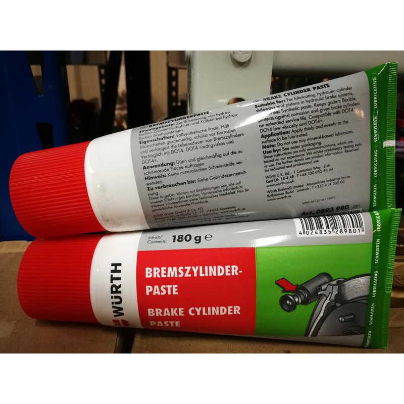 Fully synthetic brake cylinder paste for hydraulic brake systems Keeps sleeves supple Compatible with DOT 3, DOT 4, DOT 5.1 brake fluid Protects against corrosion Extends the brake cylinder service life