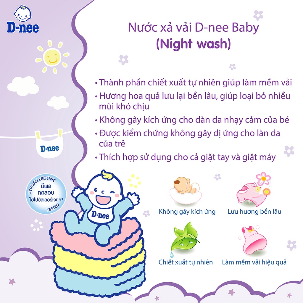 - Thành phần chiết xuất tự nhiên giúp làm mềm vải - Hương hoa quả lưu lại bền lâu, giúp loại bỏ nhiều mùi khó chịu - Không gây kích ứng cho dàn da nhạy cảm của bé - Được kiểm chứng không gây dị ứng cho làn da của trẻ - Thích hợp sử dụng cho cả giặt tay và giặt máy