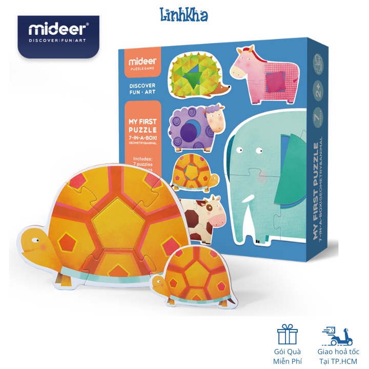 Recommended for ages 2 years and above Materials: Cardboard paper Includes 7 animals and geometry puzzles and 32pcs jigsaw puzzles My Mideer Puzzle set series are great ""starter"" puzzles and will help little hands develop their fine motor skills Lovely animals and different geometric shape makes it quite popular with children Kids can learn about the geometry through playing Develop visual sense, sense of grab, hand-eye coordination skills, improve dexterity, and expand knowledge Perfect gift for kids ----------------------- 🐬 LinhKha - Sách và Đồ chơi cho bé Từng sản phẩm trong nhà LinhKha đều được chọn lọc kỹ càng theo tiêu chí ""Bán hàng cho con bạn như chọn cho con mình"" Tất cả sản phẩm đều được nhập khẩu/ mua chính hãng. Có đầy đủ hoá đơn và chứng chỉ hợp quy. Chất lượng an toàn cho bé. Ba mẹ yên tâm ạ!