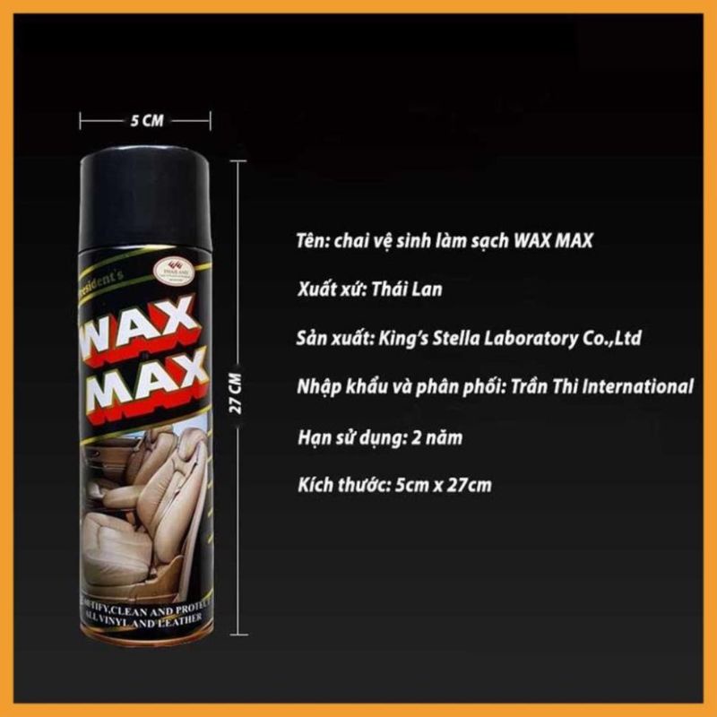 Chai xịt đánh bóng và làm sạch Wax Max, làm sạch nội thất ô tô, chai vệ sinh đồ da 1. Thông tin chi tiết sản phẩm chai xịt bóng - Tên chi tiết sản phẩm: Chai xịt đánh bóng và làm sạch da, gỗ, nhựa, cao su, kim loại Waxmax - Được sản xuất bởi công nghệ nano của Thái Lan theo tiêu chuẩn BVQI EU (Châu Âu) - Thương hiệu: WAXMAX - Công ty sản xuất: King’d Stella Laboratory Co.,Ltd. - Được nhập khẩu bởi Tran Thi International Co.,Ltd. - Khối lượng: 500 gram - Thể tích: 500ml