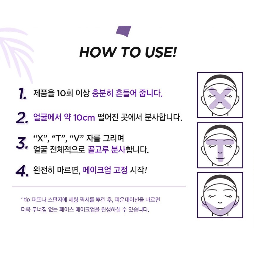 Cách dùng: lắc nhẹ chai, giữ thẳng chai cách mặt 15-20cm xịt rồi để khô tự nhiên