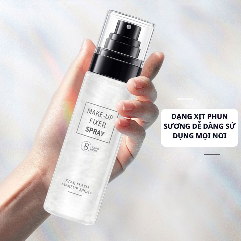 Xịt khóa giữ lớp trang điểm Makeup Fixer Spray 100ml - Khóa nền giữ trang điểm lâu trôi, dưỡng da XK01 BẢO BỐI CHO LỚP MAKE UP BỀN ĐẸP CẢ NGÀY DÀI Thời tiết thay đổi liên tục, hoạt động, di chuyển nhiều có thể khiến lớp trang điểm của bạn gái bị trôi màu nhanh Xịt make up Fixer Spray - Cố định lớp make up bền đẹp, mịn, không vệt,nứt và không trôi cả ngày 18-24 tiếng kể cả gặp thời tiết nắng nóng - Kiểm soát bã nhờn, kiềm dầu hiệu quả - Giữ lớp make up không bị mốc, loang lỗ - Nâng tông da, cho làn da sáng mịn màng lấp lánh - Thành phần an toàn, không gây kích ứng - Cung cấp độ ẩm, đem đến sự mềm mại cho làn da. - Thích hợp sử dụng cho mọi loại da, kể cả da dầu, da hỗn hợp thiên dầu và da khô.