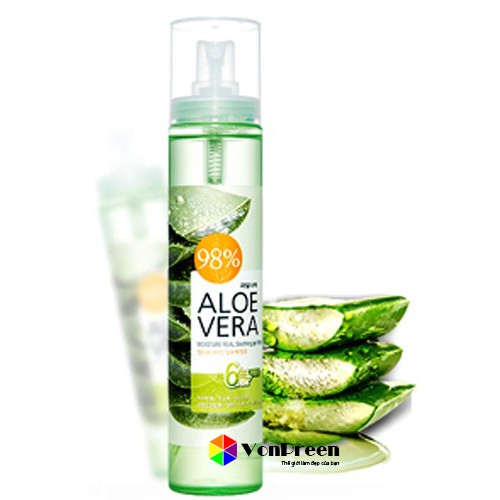– Công dụng: Xịt khoáng lô hội nha đam Aloe Vera Soothing Mist 98% là sản phẩm xịt khoáng chiết xuất 98% từ lá nha đam tự nhiên tươi mới, giúp phục hồi nhanh chóng làn da khô rát ửng đỏ, giữ ẩm nhẹ nhàng, trả lại vẻ trắng hồng khoẻ mạnh rạng rỡ đầy sức sống cho làn da của bạn. Sản phẩm xịt khoáng chiết xuất 98% từ lá lô hội được dùng cho tất cả các loại da, kể cả những làn da nhạy cảm bởi tính trung hòa của các thành phần có trong lá lô hội. Giữ ẩm nhẹ nhàng. Cung cấp các khoáng chất cho da không những giúp da khỏe hơn, căng mịn hơn mà còn xóa tan các dấu hiệu mệt mỏi trên gương mặt bạn, giúp giữ lớp trang diểm lâu trôi.