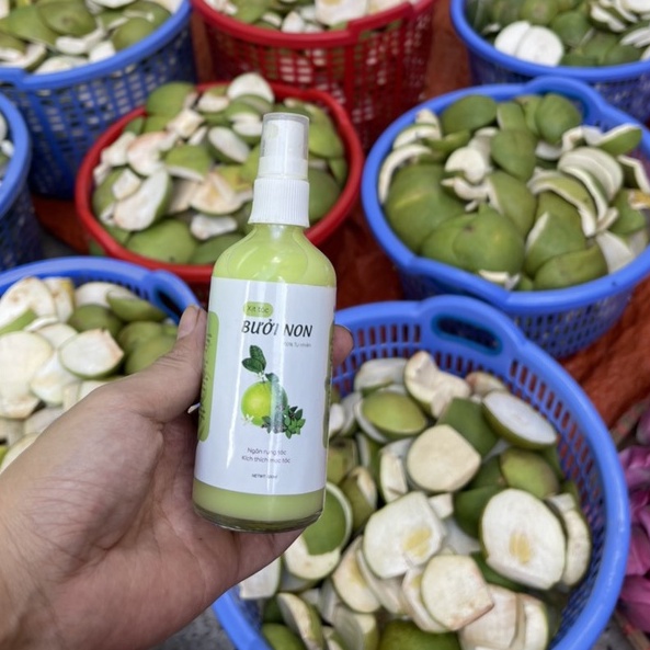 - THÀNH PHẦN xịt mọc tóc: + Tinh dầu bưởi non, tinh dầu hoa bưởi, vitamin E, protein, vitamin pro B5, karatin