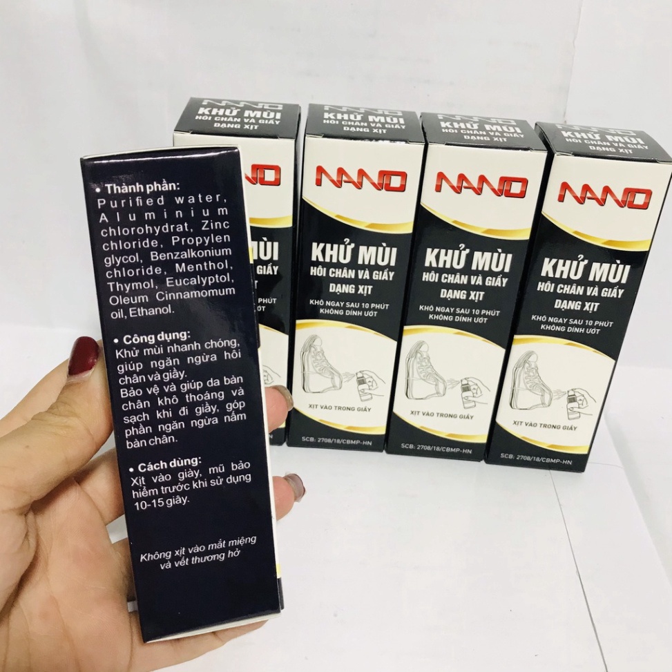 Xịt Khử Mùi Hôi Chân Và Giầy Công Nghệ Nano, Xịt Nón Bảo Hiểm Ngồi phòng máy lạnh, hoặc ngồi họp mà bỏ chân ra khỏi giầy tỏa ra mùi kinh khủng thì khó xử quá, hãy sử dụng chai xịt khử mùi hôi giầy để tránh khỏi những tình huống này nhé Xịt khử mùi hôi chân nano và giầy nano hiệu quả - Chống đổ mồ hôi chân - Hạn chế sự gia tăng của vi khuẩn gây mùi ở chân và giày - Hiệu quả kéo dài 24 giờ - Khô thoáng ngay sau khi xịt Dung tích: 100ml Cách dùng - Lắc đều sản phẩm trước khi dùng. - Xịt trực tiếp vào bên trong giầy - Xịt sản phẩm trước khi mang giầy hàng ngày. - Bảo vệ đôi chân thoáng mát, sảng khoái - Ngăn ngừa vi khuẩn gây mùi Đặc điểm nổi bật của sản phẩm: - Không chứa nước hoa, dùng được cho cả nam và nữ - Không gây kích ứng da - Khô nhanh, không gây dính cho chân - Dạng xịt, chai nhỏ gọn có thể mang theo đi làm, đi chơi đều tiện