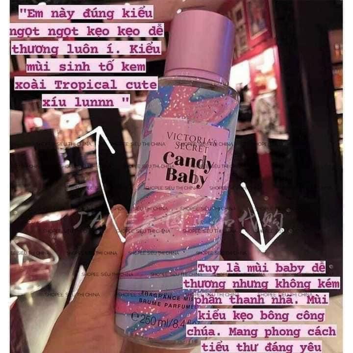 ❤️Body mist là sản phẩm 2 in 1 vừa là nước hoa vừa có tác dụng dưỡng thể. Nếu bạn không thích mùi nồng hắc quá mức của nước hoa thì đây là sản phẩm dành cho bạn. Body mist cực kì phù hợp với dân văn phòng hay những bạn học sinh, sinh viên còn đang đi học 💥Candy Baby (a warm fruity glazed mango and and sugar scent)- ngọt như hương trái cây