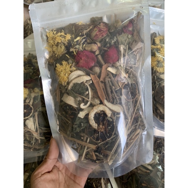 THÀNH PHẦN: Sả, đại hồi, kinh giới, tía tô, trần bì, bạc hà, quế chi,hoắc hương ,bạch chỉ, Quế, vỏ bưởi, hoa hồng, hoa cúc, hoa nhài, hương nhu, hoa hồi, ngải cứu...