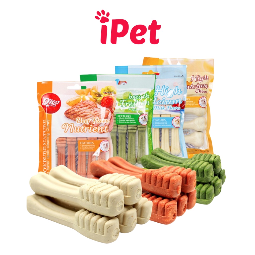 * Peppermint - Vị bạc hà: Xương cho chó gặm giúp làm sạch răng. Sản phẩm có chứa các thành phần bạc hà tự nhiên có khả năng loại bỏ các vi khuẩn gây hôi miệng, làm sạch răng và bảo vệ cao răng cho chú chó của bạn một cách nhanh chóng. * Beff Flavor - Vị thịt bò: Xương cho chó gặm giúp làm sạch răng sản phẩm chứa các thành phần thịt bò tự nhiên bổ xung dinh dưỡng và năng lượng, cấu trúc xương giúp loại bỏ mảng bám. * Milk - Vị Sữa: Xương cho chó gặm giúp làm sạch răng Sản phẩm chứa các thành phần sữa bò tự nhiên tăng cường canxi, cải thiện khả năng nhai rất tốt cho sự phát triển của cún.