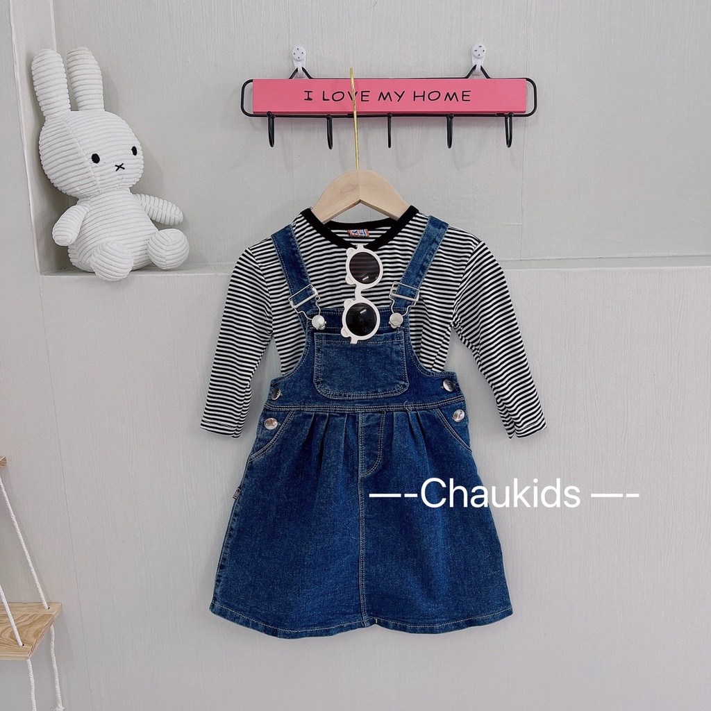 Thời Trang Trẻ Em > Quần áo em bé > Váy/đầm > Yếm váy bò xòe kèm áo kẻ bé gái