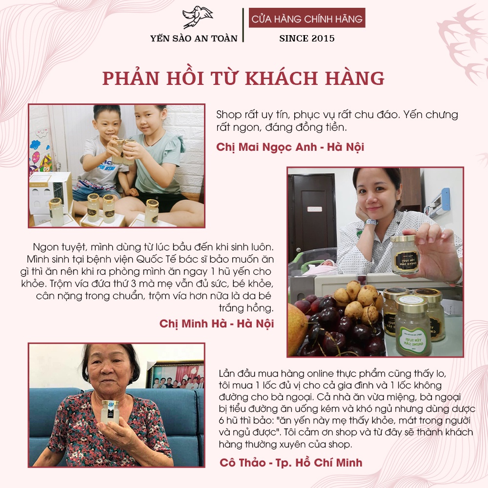5 lý do khách hàng luôn tin tưởng và lựa chọn Yến Sào An Toàn: - Sản phẩm an toàn: công bố chất lượng tại Ban Quản lý An toàn thực phẩm TP.HCM. - Tất cả sản phẩm đã được kiểm nghiệm tại Eurofins Sắc Ký Hải Đăng đạt tiêu chuẩn Vilas 238, Vimcerts 271 và Ilac - MRA. - Sản phẩm chất lượng: có 7g yến tươi trong hũ 70ml; 14g yến tươi trong hũ 140ml. - Sản phẩm tự nhiên: hoàn toàn không dùng chất bảo quản, tạo màu, tạo mùi. - Và trên hết là tình yêu sản phẩm của Yến sào An Toàn, từ 2015 cho đến nay và mãi về sau giữ nguyên Cam Kết 100% yến an toàn và nguyên chất đến tay người tiêu dùng.