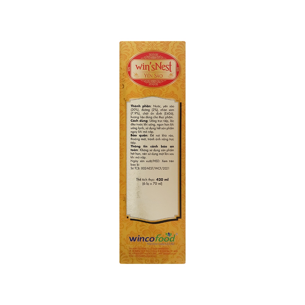 Tổ yến chưng sẵn (20%), nhân sâm (7.9%), đường (2%) Sản phẩm giúp bồi bổ sức khỏe tăng cường sức đề kháng, giảm căng thẳng, mệt mỏi, chống lão hóa Bổ sung axit amin cho cơ thể giúp tăng cường sức khoẻ, bồi bổ khí huyết và nâng cao sức đề kháng. Ngoài ra tổ yến còn giúp làm chậm quá trình lão hoá của cơ thể do tuổi tác nếu dùng thường xuyên. Người có huyết áp không ổn định nên tham khảo ý kiến bác sĩ trước khi sử dụng sản phẩm. Thành phần: Nước, yến sào (20%), đường (2%), nhân sâm (7.9%) chất ổn định (E406), hương liệu dùng cho thực phẩm. Các chỉ tiêu chất lượng: Protein, canxi, năng lượng. Sản phẩm thích hợp cho người lớn, người bệnh đang trong quá trình phục hồi sức khỏe Yến sào cao cấp win'sNest tổ yến chưng sẵn nhân sâm ít đường được sản xuất từ nguồn yến đảo thiên nhiên, là một sản phẩm của công ty wincofood. Được sản xuất bằng phương pháp cổ truyền trên dây chuyền đạt tiểu chuẩn an toàn thực phẩm. Đảm bảo theo tiêu chuẩn hệ thống chất lượng quốc tế ISO 9001:2015 và HACCP Sản phẩm thích hợp cho người lớn phục hồi sức khỏe, trẻ em từ 3 tuổi trở lên. Người có huyết áp không ổn định nên tham khảo ý kiến bác sĩ trước khi sử dụng sản phẩm 🧉 Sử Dụng: - Dùng Trực tiếp - Uống từ 1 - 3 hũ / ngày - Sử dụng hết 1 lần sau khi mở nắp.