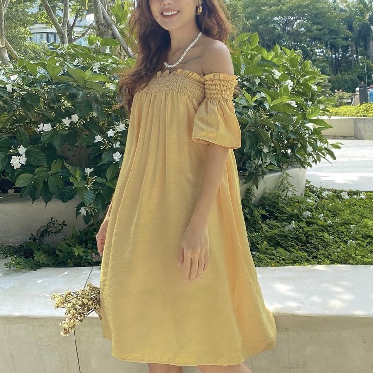 Giới thiệu YU CHERRY | Đầm nữ trễ vai vải linen mịn Drop Off Shoulder Dress YD135