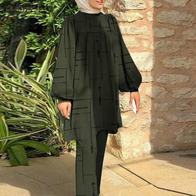 Giới thiệu Zanzea Bộ Áo Sơ Mi Tay Phồng Cổ Đứng In Họa Tiết + Quần Dài Lưng Thun Ống Rộng Thời Trang Đường Phố Cho Nữ