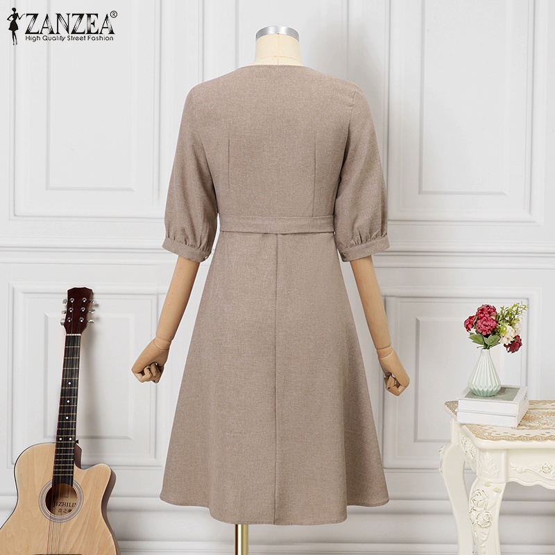 Giới thiệu ZANZEA Đầm Chữ A Tay Phồng Cổ Chữ V Lưng Cao Phối Khóa Kéo Thời Trang Hàn Quốc Cho Nữ