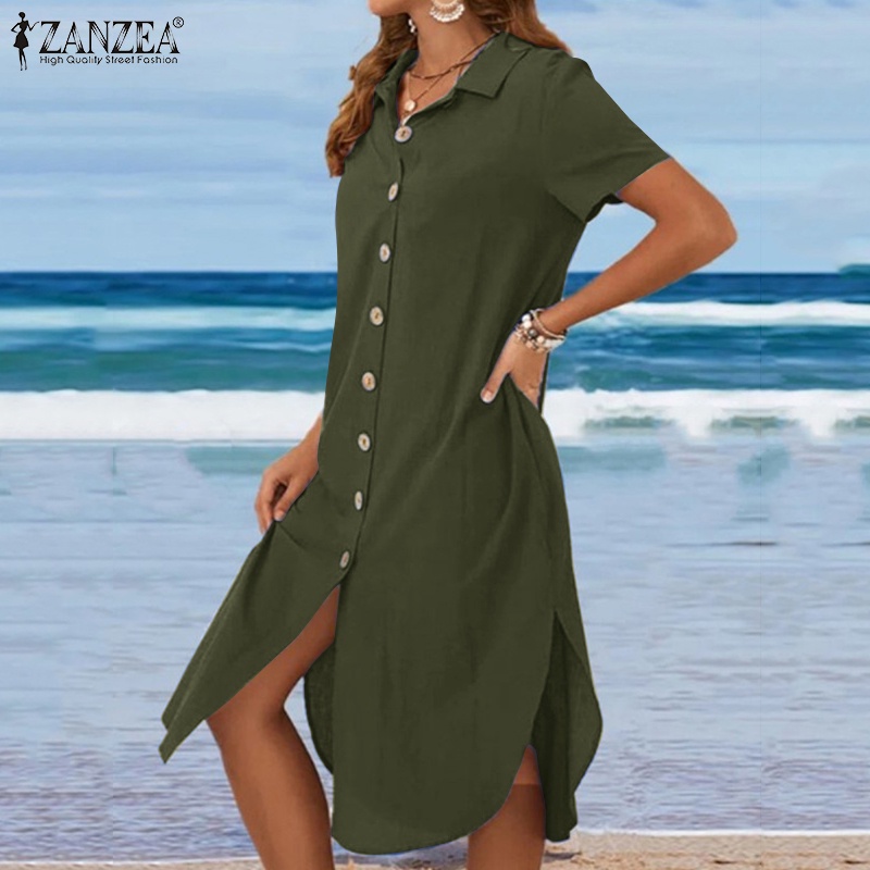 Giới thiệu Zanzea Đầm Cotton Xẻ Tà Phối Túi Thời Trang Châu Âu Cho Nữ