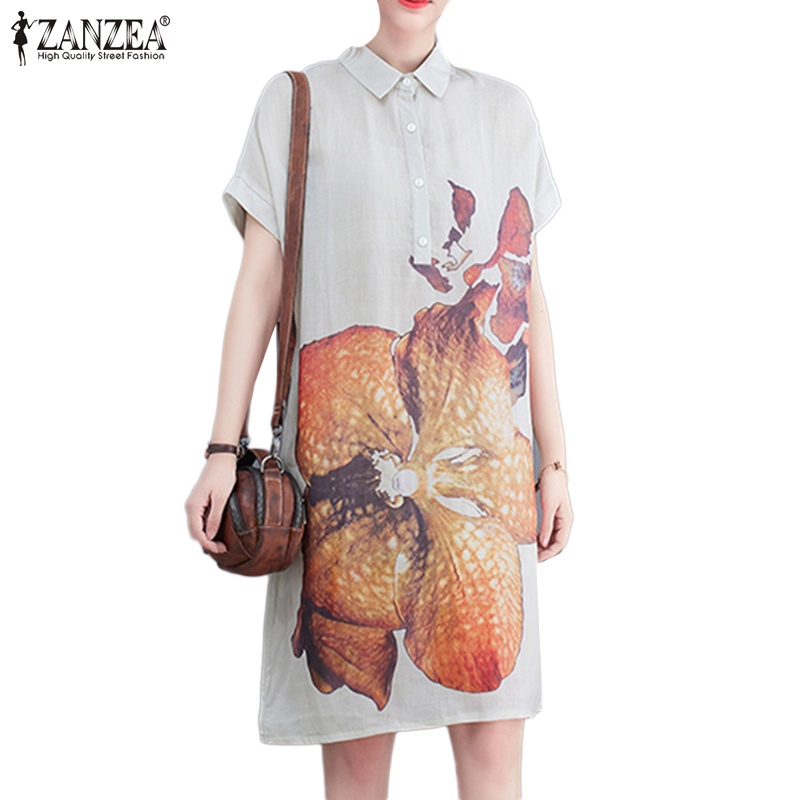 Giới thiệu ZANZEA Đầm Midi Tay Ngắn Cổ Bẻ Form Rộng In Họa Tiết Vintage Thời Trang Cho Nữ