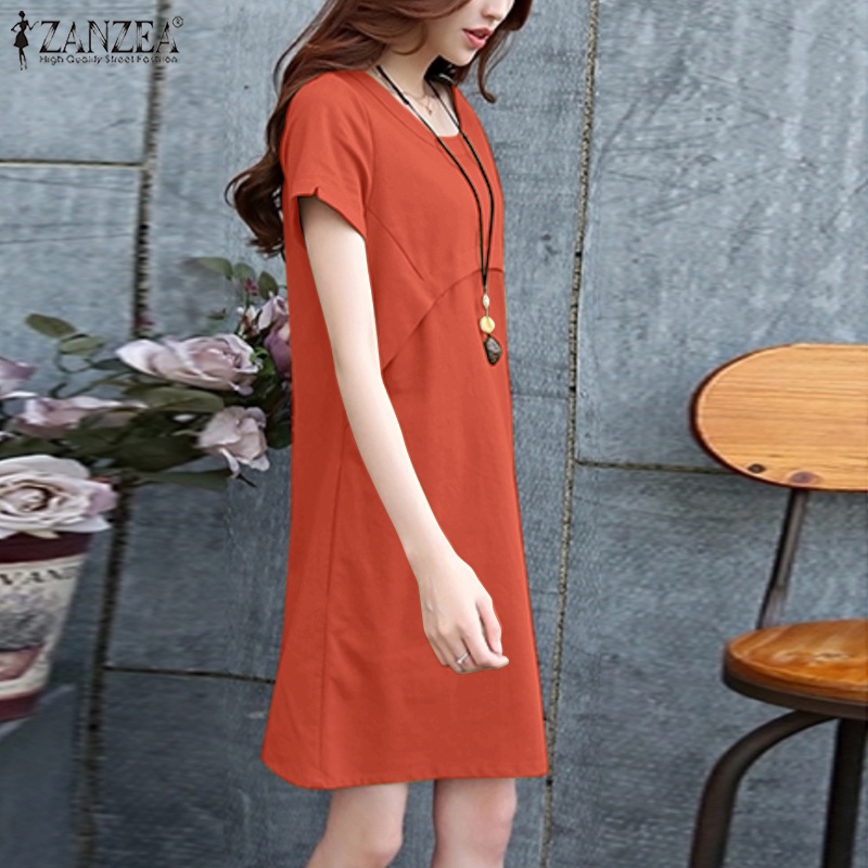 Giới thiệu ZANZEA Đầm Mini Cổ Tròn Tay Ngắn Màu Trơn Dáng Rộng Thời Trang Cho Nữ