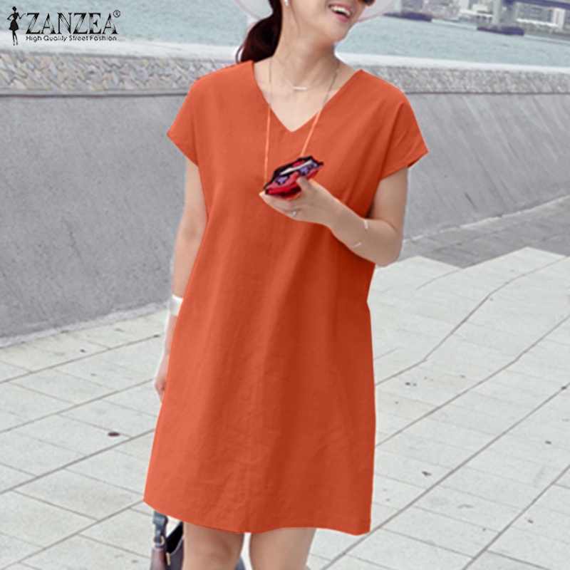 Giới thiệu Zanzea Đầm Nữ Ngắn Tay Cổ Chữ V Màu Trơn Phong Cách Hàn Quốc