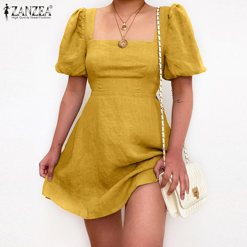 Giới thiệu ZANZEA Women Short Puff Sleeve Square Neck Zipper Slim Fit Short Dress